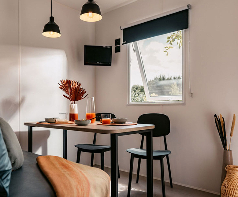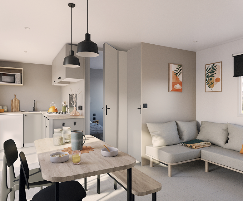 Chaque mobil-home de la gamme Confort dispose d’un aménagement fonctionnel et lumineux, favorisant la convivialité et le confort au quotidien. La terrasse haute semi-couverte permet de profiter pleinement de l’extérieur, pour partager un repas, se détendre ou prolonger les soirées d’été.